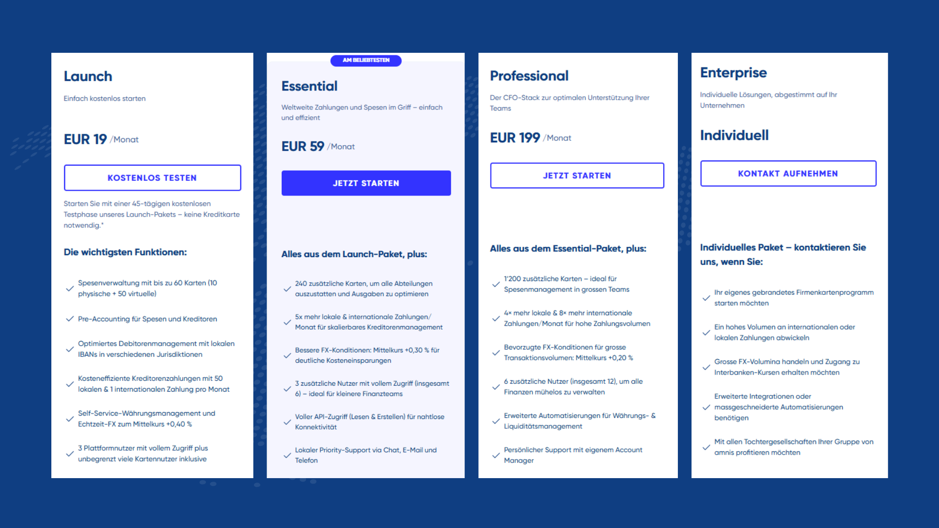 Wenn Sie mehr als 10 physische Karten benötigen oder von günstigeren Fremdwährungskursen profitieren möchten, können Sie sich für das Essential- oder Professional-Paket entscheiden oder Ihr Launch-Paket zu einem späteren Zeitpunkt erweitern.